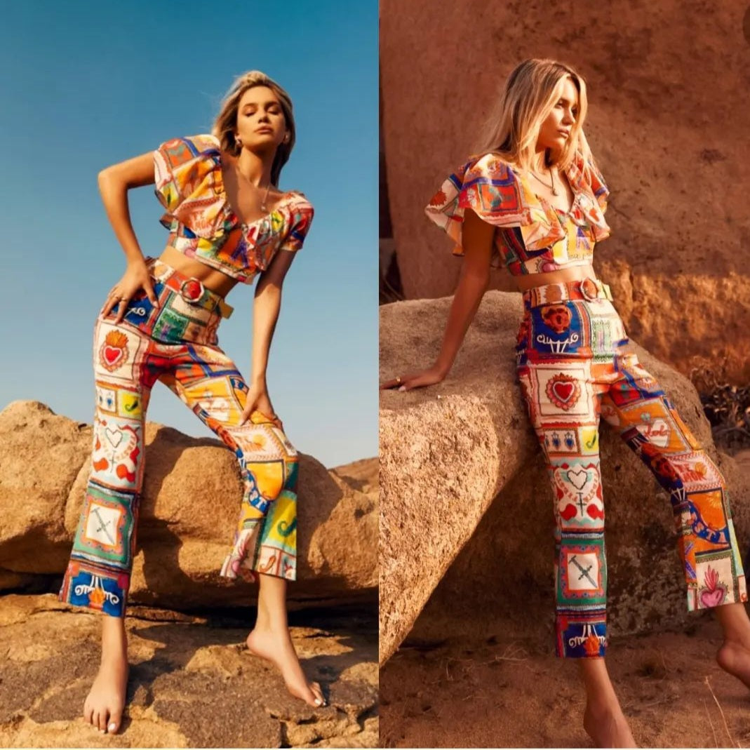 A bold patterned flare pant and top set with matching belt will bring fun and vibrant vibes to your next event.